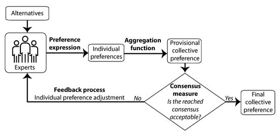 Experts’ preferences are often vague and imprecise [4,5]. In these situations, Artificial Intelligence (AI) techniques are applied. For example, experts’ opinions are sometimes expressed as fuzzy preference relations that for each pair of alternatives and , indicate the expert’s preference degree of over . In these cases, individual preferences are aggregated using Ordered Weighted Averaging (OWA) operators [6], and fuzzy consensus models look for a solution supported by all or, at least, the majority of the experts [7]. Other times, experts’ preferences are conveyed linguistically, combined with Linguistic Ordered Weighted Average (LOWA) operators [8], and linguistic consensus models are used [9]. There are many other real-world GDM problems that use AI techniques as well, such as dealing with heterogeneous preference representation structures [10], detecting and managing non-cooperative experts’ behaviors [11], etc.