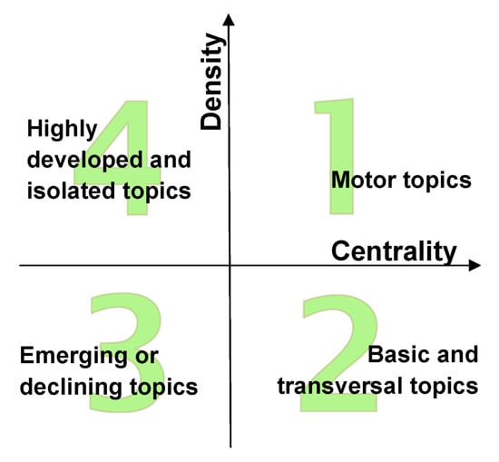 Strategic diagrams are then used to provide a global representation of all topics’ role. In these diagrams, the x-axis and y-axis denote the network’s centrality and density, respectively. Thus networks are classified according to the quadrants where they are placed [51,52]; see Figure 3.