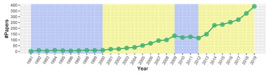 Figure 4 shows the number of published papers per year. Colors blue and yellow denote periods of stability and growth, respectively. In particular, four stages can be distinguished: