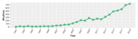 Figure 6 represents the number of authors per year. As the number of articles increases over time, the number of authors rises as well. There is a total of 3514 authors. Although most of them have published a pretty reduced number of papers (67.92% of the authors have written only one paper in 29 years), a small group of authors have contributed with a much bigger number of articles (8.22% of the authors have published at least five articles). This fact is not surprising, as it is consistent with one of the fundamental laws in bibliometrics: Lotka’s law [53] (also known as the inverse square law).