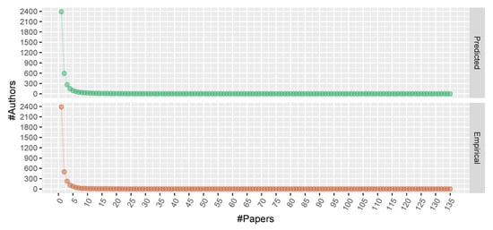 In 1926, after analyzing authors’ productivity in different domains, Lotka found that the number of authors with n papers is usually inversely proportional to . In our case, 2387 authors have written one article; hence, Lotka’s law predicts that the number of authors that have published n papers should be . Figure 7 compares the empirical distribution found in the sample with the distribution predicted by Lotka’s law, showing that both distributions fit much.