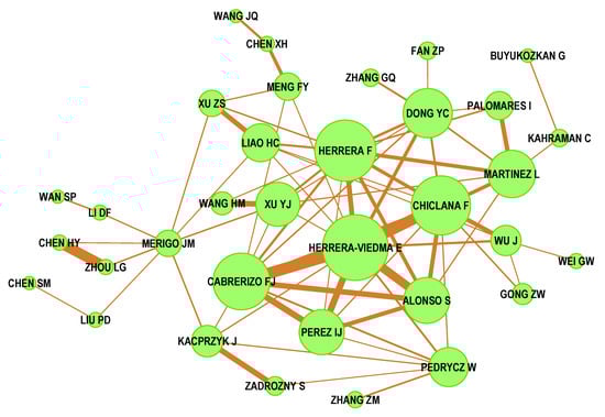Accordingly, studying the collaboration between authors has a remarkable interest [45]. The graph in Figure 9 represents how the most productive authors collaborate. Each node accounts for one of the top 1% most prolific authors. The size of each node is proportional to its Eigenvector centrality in the collaboration network. This centrality models the importance of a node considering not only the number and weights of its connections to other nodes but also the influence of those nodes in the network [55]. There is an edge between two nodes whenever the corresponding authors have published some paper together. Edge thickness is proportional to its weight, i.e., to the number of papers that both researchers have coauthored.