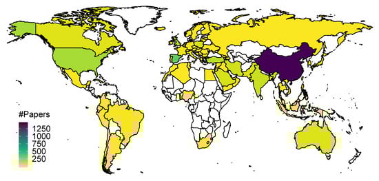 Figure 10 shows the number of papers that each country’s researchers have published. The most prolific countries are China (39.25% of the papers), Spain (9.64%), United States of America (5.15%), United Kingdom (4.29%), Taiwan (4.10%), Turkey (4.07%), and India (3.25%).
