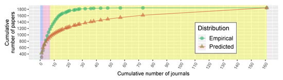 In our case, there are 2862 papers in the sample; 1016 published in conferences and 1846 published in journals. Although a total of 32 journals have published the 1856 articles, 9 of them have published 66% of the articles, i.e., journal productivity concentration is even higher than the one predicted by Bradford’s law. Figure 11 compares the cumulative distributions of the empirical data and the data predicted by Bradford’s law, according to the procedure proposed by Egghe and Rousseau [57]. Roughly speaking, suppose that the journals in the sample are sorted according to the number of articles into 3 groups, each one including of all articles approximately. Those groups are named Bradford’s zones. They are registered in Table 3’s last column, and highlighted with different colors in Figure 11 (Zone 1 in blue, Zone 2 in pink, and Zone 3 in yellow). Zone 1 comprises 2 core journals. Zone 2 includes 5 journals, thus Bradford’s constant n is . Although Bradford’s law predicts that the number of journals in Zone 3 should be , the empirical number of journals is much bigger: 25. Trying with different numbers of zones produces even more distant results.