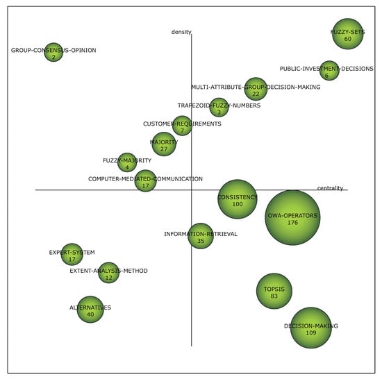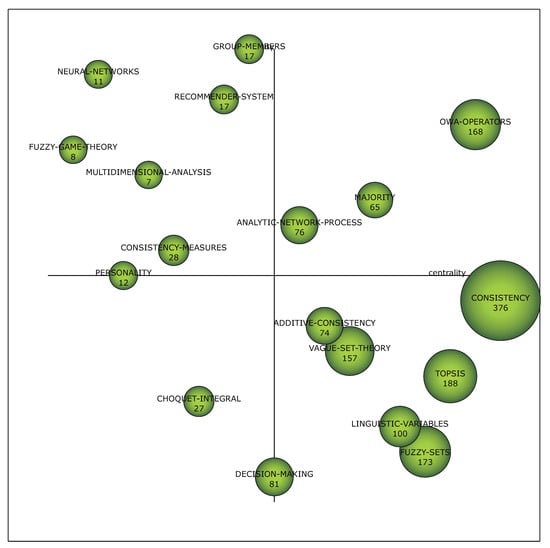 Moreover, according to the performance measures shown in Table 6, except for linguistic-terms-sets, the main themes pointed above got a great number of documents (more than 100). Taking into account the achieved citations, Term-sets was the most cited theme, with more than 11,000 citations. In comparison with the previous periods, themes have had high impact considering this period’s small citation window. In addition, themes AHP, similarity-measures, multi-attribute-group-decision-making, and consensus achieved more than 4000 citations.