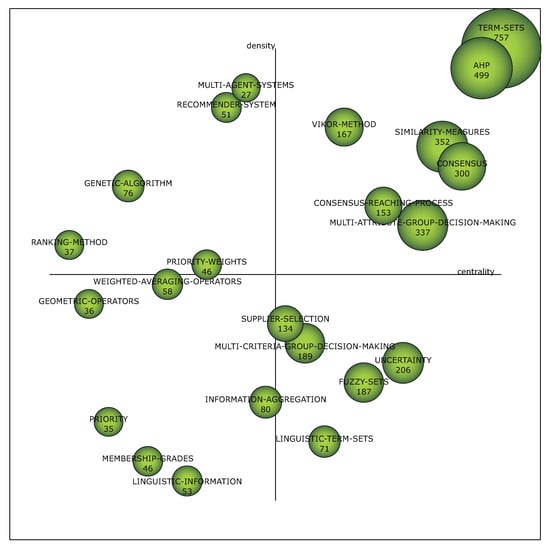 Considering the thematic areas shown in Figure 15, and their performance measures, we should point out that AI-GDM has been mainly focused on the research area of multi-attribute criteria, as it is the largest one (it has the biggest number of documents). Also, it achieves the highest number of citations count. The thematic network fuzzy-sets also has a significant number of documents, which have been highly cited.