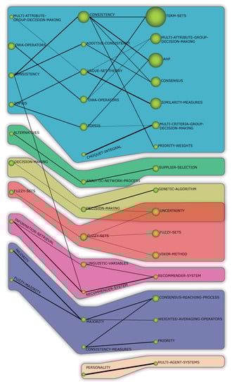 Therefore, analyzing the themes across three consecutive periods, we can summarize the conceptual evolution of AI-GDM in seven thematic areas (Figure 15): (i) multi-attribute/criteria in GDM, (ii) analytical network process, (iii) decision-making and uncertainty, (iv) fuzzy sets, (v) recommender systems, (vi) consensus and majority, and (vii) agent systems.