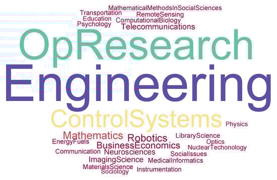 WoS provides a classification system called, research areas that organizes publications according to their subjects into 252 areas. Research literature on AI-GDM spreads over a variety of application domains: 19.67% of the papers fall into the Engineering area, 15.79% into Operations Research Management Science, 7.97% into Automation Control Systems, etc. The word cloud in Figure 16 shows the foremost application domains; words have been abbreviated, and their size is proportional to the number of articles classified in the corresponding areas.