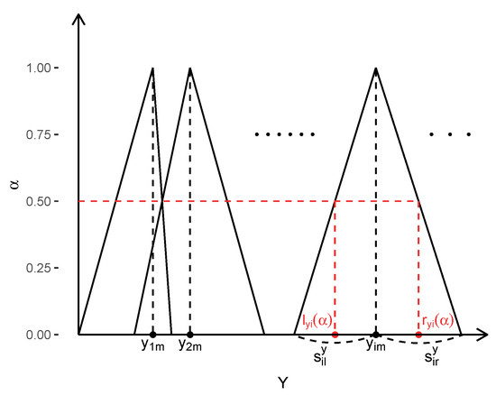 Step 4: Estimate the triangular fuzzy coefficient and its membership function by fitting a linear regression line through and for , respectively. A constraint is given so that satisfy the condition of (see Figure 4).