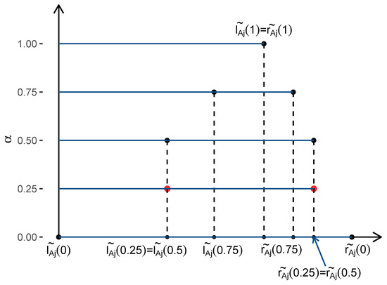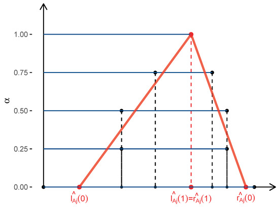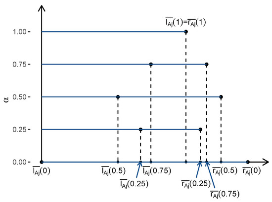 A fuzzy set is a set of ordered pairs where is a membership function which represents the degree of membership of x in a set A. Please note that when A is a crisp (classical) set, its membership function can take only the values one or zero depending on whether or not x does or does not belong to A. In this case, reduces to the indicator function of a set A. For any in , the -level set of a fuzzy set A is a crisp set which contains all the elements in X with membership value in A greater than or equal to . The -level set of a fuzzy set A can also be represented by . Here and are the left and right end-points of the -level set, respectively. Zadeh’s [23] resolution identity theorem states that a fuzzy set can represented by its membership function or by its -level set. Let A be a fuzzy number with membership function and -cut . Then we have .