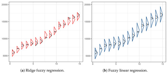 Tanaka et al. [10] presents a data set concerning the price mechanism of prefabricated houses. The relationship between five crisp inputs (rank of material, first floor space (m2), second first floor space (m2), number of rooms and number of Japanese-style rooms) and a fuzzy output (house price) is investigated. The complete data is shown in Table 8. The fitted values for the ridge fuzzy model and the linear fuzzy model is shown in Table 9. Results show the predicted values from the ridge fuzzy regression more accurately describes the original data than fuzzy linear regression. This is again clarified in Figure 5. In the triangular fuzzy plot of the observed and fitted values, a comparison of the two models is shown. The black triangles correspond to the observed values, the red triangles in Figure 5a to the ridge fuzzy fitted values, and the blue triangles in Figure 5b to the fuzzy linear fitted values. Both methods estimated the mid-points of the fuzzy dependent variable well. The spreads however, are shorter for the proposed ridge fuzzy regression than the other. The fitted equation for the ridge fuzzy regression is given by