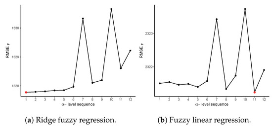 An analysis of the -level sequences used in Step 6 of the estimation algorithm is presented in Figure 6. The -level sequence which minimizes was chosen as the optimal -level sequence for each of the models. The red dots in Figure 6a,b each indicate the chosen -level sequence based on . For the ridge fuzzy regression, , with was chosen. In the case of fuzzy linear regression, was selected.