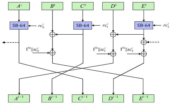 The ACE permutation is an iterative permutation with 320-bit input and a 320-bit output after iterating the step function for  times. During the encryption/decryption process, the 320-bit value is arranged as the state. Each 320-bit state is divided into five 64-bit words, written as A, B, C, D, E, in every step. The step function of ACE consists of a nonlinear function and a linear function. The nonliniear function  is applied on even indexed words respectively (i.e., A, C and E), where comes the permutation name. The step function is shown in Figure 1.