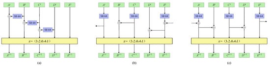 The encryption characteristic matrix of ACE permutation is , which we denote as . This matrix reaches  after 5 rounds of iteration. The structure of decryption permutation is depicted in Figure 3, from which we know the decryption characteristic matrix of ACE is , denoted by .  reaches  after 5 rounds of iteration as well. Let  be a differential of probability 1 from the encryption direction and  be a differential of probability 1 from the decryption direction. If the i-th sub-block of  is active whereas the i-th sub-block of  is 0, then there is  with probability 1. Then  is an impossible differential. For ACE permutation, there will not be zero difference after 5 rounds in the encryption/decryption direction, which means there will not be contradiction in the middle. □