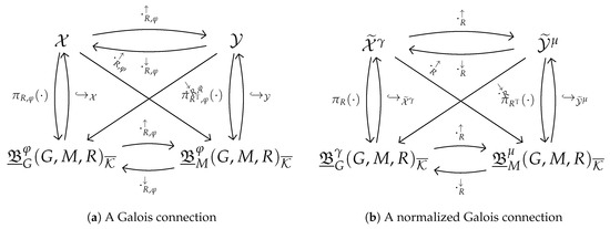 Compare the mathematical objects above with those in a Galois connection proper seen in the top right of Figure A2: the ranges are both closure systems and both compositions closure operators due to the dualisation of the second set (we write for the new closure operator), resulting in the well-known perfect Galois connection, , the pair of dual order-isomorphic closure ranges lying at the heart of Formal Concept Analysis. The diagrams in the bottom left and right of Figure A2 show analogue structures for co-Galois connections and right adjunctions respectively.