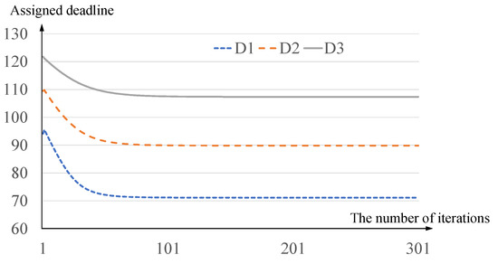 The constants are step sizes, which determine the rate of convergence of the iteration. If they are sufficiently small to satisfy Lipschitz continuity [26], they are able to guarantee the convergence. We can calculate the intermediate deadline of subtask , by solving the following differential equation in which for all [14,15]: