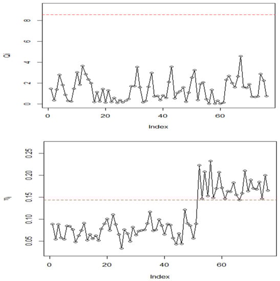 Because the domain of is , the vector of does not follow a bivariate normal distribution. In this case, the MSEWMA chart proposed by Zou and Tsung [13] can be considered to implement the process monitoring. The construction of the MSEWMA control chart is addressed as follows: Let . Two unknown parameters, the and , are needed to construct MSEWMA statistics. They can be estimated based on the Phase I sample . Let