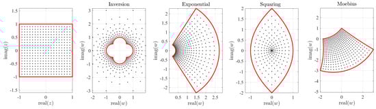 Figure 1 shows the effect of inversion (), exponential (), squaring (), and Möbius mappings for within the domain. In particular, the Möbius mapping was selected with , , , and . These values were obtained by selecting and imposing the mapping
