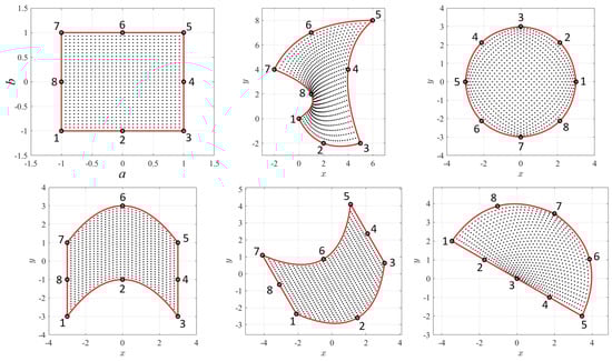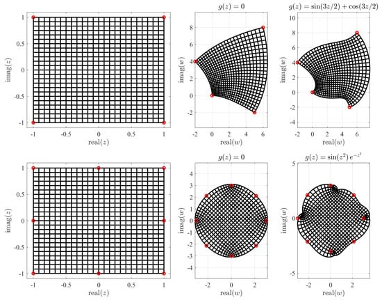 Figure 2 shows one effect of the free function in the complex mapping defined by the control points from Equation (4). The free function modifies the domain while the conformal property is still preserved. The top-left plots of Figure 2 shows a grid of orthogonal lines in the Z domain, while the top-center plot shows the lines mapped in the corresponding W domain using , i.e., using Equation (3), and the control points given in Equation (4). The free function does not change the mapping of the control points. The points mapping is the constraint embedded in Equation (5). The top-right plot shows the mapped W domain obtained using the free function , i.e., applying Equation (5). This shows the free function “rubber” effect on the W domain. While the top figures use four control points (red dots), the bottom plots are obtained for eight control points distributed along a circle and using for the free function, the expression . This example highlights that the selection of control points is not completely free because they often produce non-bijective mappings (points in the W domain may be associated with multiple points in the Z domain). Non-bijective mappings may occur when one or more control points fall inside the W domain.