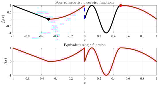 applied for piece-wise functions, is shown at the bottom plot of Figure 5. In particular, this example includes, continuity (black marker) at , discontinuity (blue dashed line) at , and and continuity (red marker) at .