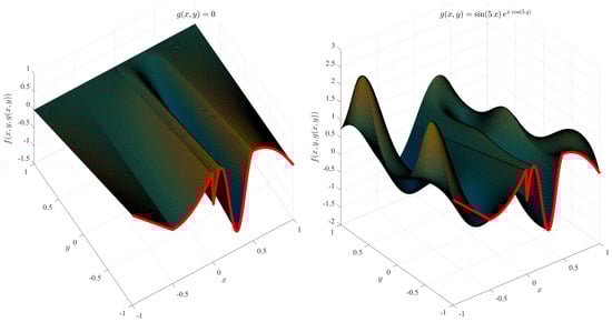 The single function, , can be used in the TFC framework to represent a boundary constraint. Figure 6 shows two TFC surfaces using the single constraint boundary function, , shown in red and for two different expressions of the free functions: (left figure, most simple interpolating surface) and (right figure).