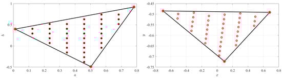 Let a and b be the coordinates in Z of a given point inside the original domain that is required to be transformed, and x and y be the coordinates in W of the transformed point. Moreover, , are the coordinates of the projections points in Z and W respectively, while , and , with , are the coordinates of the n control points defined in Z and W respectively plus the first one repeated in order to close the polygon. Please note that the control points have to be consecutive, i.e., it must be possible to generate the polygon by linking the control points in the order provided.