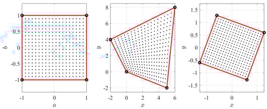Again, the mapping is performed between the unit-square domain, , shown in top-left of Figure 8, and the quadrangular polygonal domain, defined by the four points, and , shown in top-right of Figure 8. In particular, the mapping has been performed using a grid of 400 points.