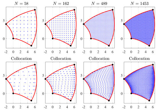 Figure 11 shows, for 57, 162, 488, and 1453 points, respectively, the selection of grid of points for the top-center domain shown in Figure 2. Using a simple algorithm it is possible to obtain collocation-type of points. This is show in the bottom plots of Figure 11 using the same number of points.
