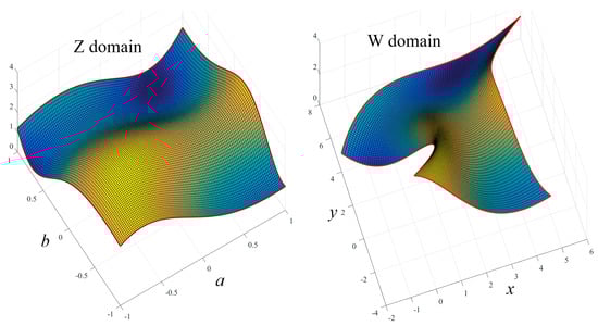 This means that the equations, , describing the boundaries of the W-domain defined by Equation (26) were used to derive the boundary constraints using the surface. For this specific case, , was used as free function.