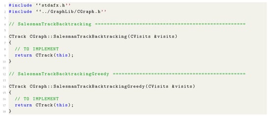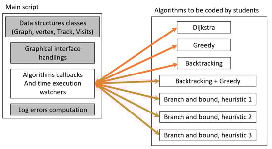 The students are provided with a partially coded C++ solution. This solution contains the code of the graphical interface, the shell of the solution to the travelling salesman problem (i.e., the main structures needed to solve the problem and all the callbacks to the scripts of algorithmic techniques) and a log with the computation errors. In addition, the students are provided with a report with the technical documentation of the solution. We sketch the idea of the solution in
