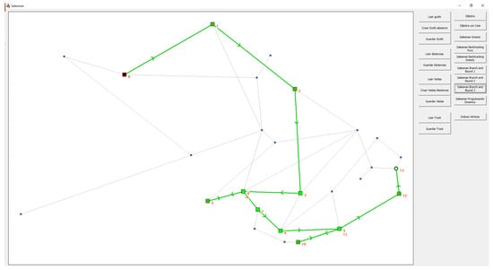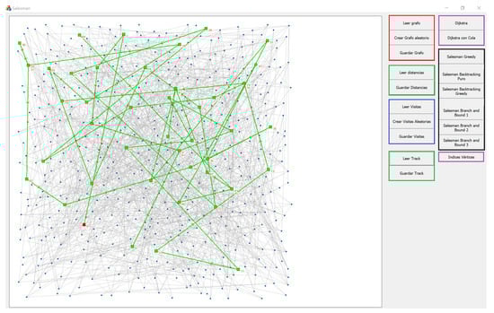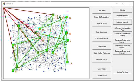 Figure 5 shows a view of the interface. On the left side, there is the visualization of a particular graph, while, on the right side, there are several modules that provide a set of utilities to explore the different necessary aspects to work in each phase of the project. These utilities can be split in five different categories: graph handling, visits handling, solution handling, algorithmic techniques, and intermediate utilities.
