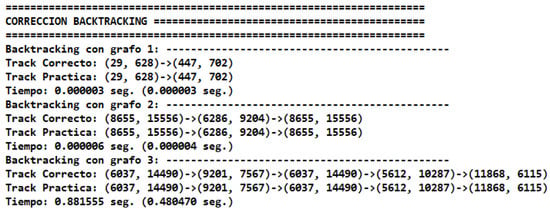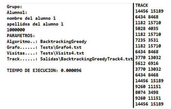 Figure 6 shows an example of the text files that were obtained for the graph number 4 and the algorithm Backtracking + Greedy. On the right side, we can observe the track obtained by a student.