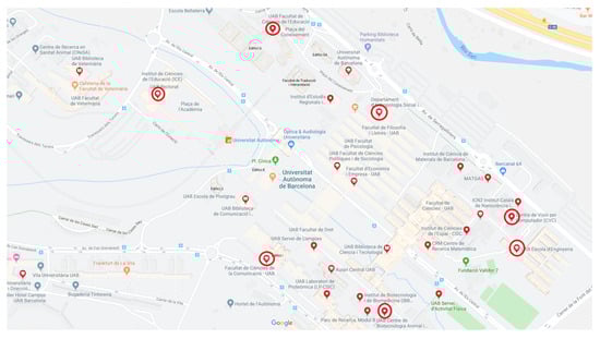 Every day, the postwoman of the university needs to go through all the faculties and other points that have mail. The points that have mail changes from one day to the other. Figure 9 shows an example: All possible points to deliver mail are marked in red check point, while points which has mail to deliver today are as well circled in red. The postwoman wants to deliver the mail to the target locations in the shortest possible time, and since she rides a bicycle we can consider that paths between locations are straight ones.