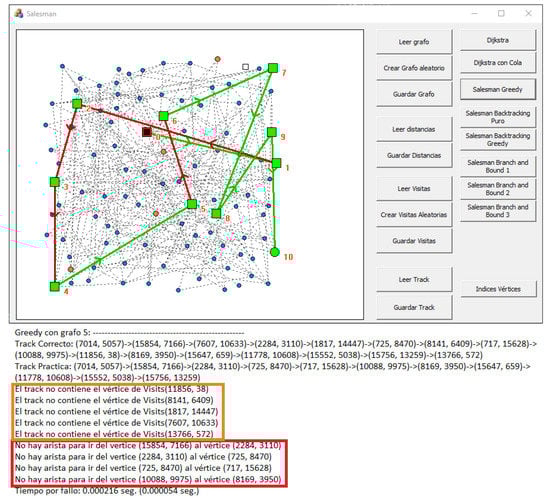 Figure 13 shows two different errors. On the one hand, the track obtained joins several vertices by non-existent edges, which can visually be observed in red. Additionally, the log points out these errors by a message, which can be observed in the bottom of the figure (boxed in red). On the other hand, there remain some unvisited vertices to visit, which can also be observed in orange, but, also, text log warns about it to reinforce the message (boxed in orange in the figure).