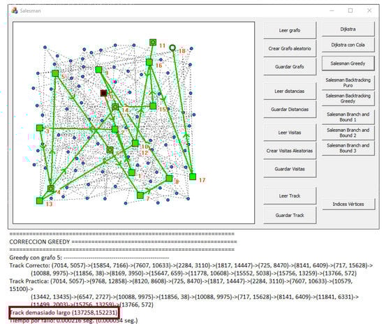 Besides, once students code each algorithm, they can visually check the correctness of their solutions in two different ways. On the one hand, they can display the output of their algorithm and manually reconstruct the track to check whether the algorithm builds the solution in the expected order. On the other hand, they can test their algorithms with a dataset of 10 different graphs that were already prepared and given by the teaching staff. This dataset contains a set of graphs with their corresponding visits, distances between points, and optimal tracks. The students can load a particular graph from this dataset and compare the output that they obtained with the tracks. Both ways of testing serve to provide students with their own immediate feedback.