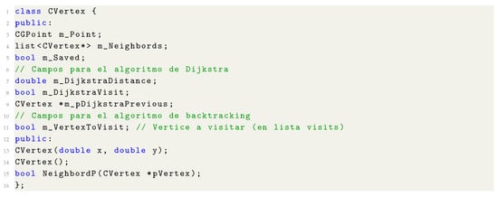 CVertex class represents a vertex in the graph. This class contains the point on the Euclidean plane where the vertex is and a list of its neighbors. Additionally, it contains the fields m_DijkstraDistance and m_DijkstraVisit, which are necessary for coding Dijkstra algorithm.