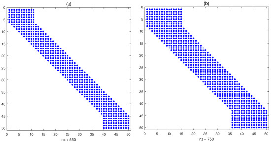Sparsity patterns for and two stencil sizes (a) and (b).