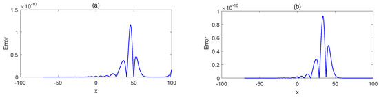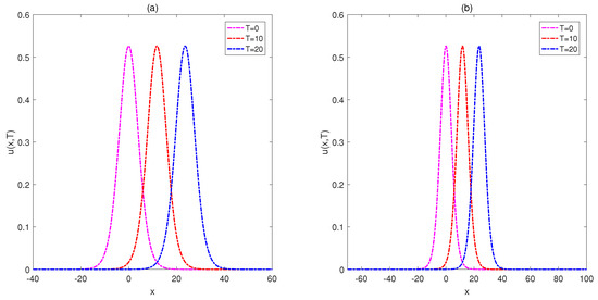 Motion of the single solitary wave with (a) and (b) over the interval at final times (a) and (b) for Example 3.