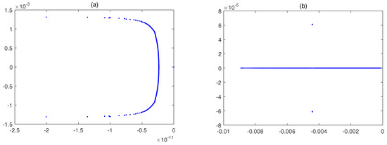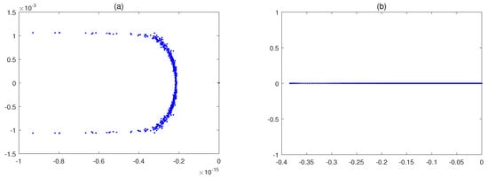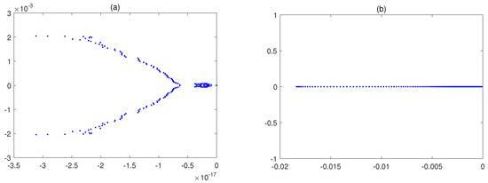 The eigenvalues of (a) and (b) for , and for Example 3.