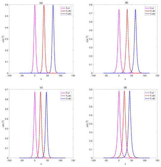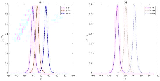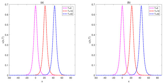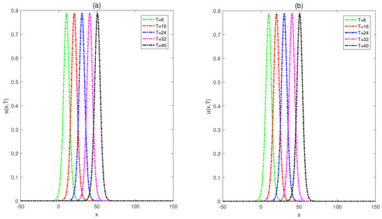 Motion of the single solitary wave with (a) and (b) over the interval at final times for Example 4.