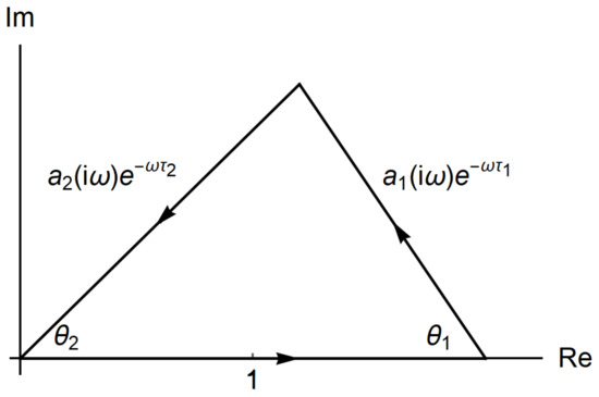 Equation (3) must have a pair of pure imaginary solutions when a stability switch occurs. Hence let with (It is possible to take its conjugate with . Even so, we can arrive at the same result.) and we may consider the three terms in (3) as three vectors in the complex plane with the magnitudes and , respectively. Equation (3) means that if we put these vectors head to tail, they form a triangle with the internal angles and as illustrated in Figure 1.