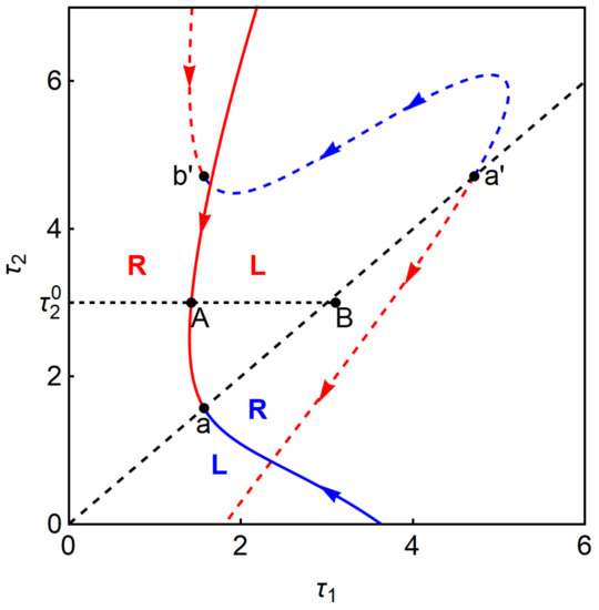 In the following, we will construct stability switching curves. To this end, we specify the parameters’ values as and In Figure 3, the dotted red loci are described by with and and the dotted blue locus by . The black point is the initial point of and and its coordinates are