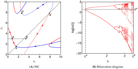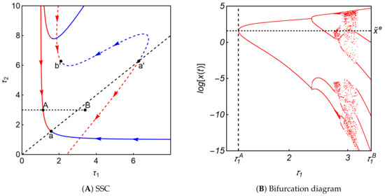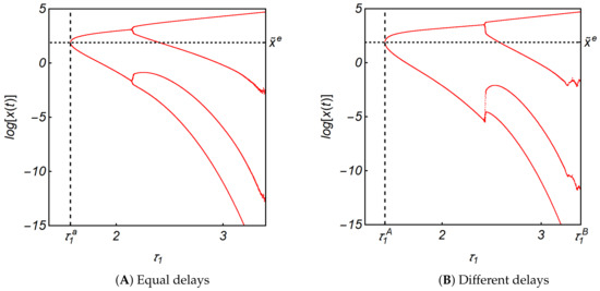 producing a limit cycle that further bifurcates to a multi-periodic cycle for larger delays. The second result with the different two delays is given in Figure 4B. The value of increases from to along the dotted horizontal line at . More precisely, the bifurcation diagrams with two delays are constructed in the following procedure with Mathematica, version 12.1. The value of is fixed at and the value of is increased from to with an increment . For each value of dynamic system (11) runs for and the data for are discarded to get rid of the initial disturbance. The local maxima and minima out of the remaining data are plotted against this value. Then the value of is increased and then the same procedure is repeated until arrives at The following bifurcation diagrams are obtained in the same way. The resulting bifurcation diagram shows that the dynamic system experience similar dynamics. The stability of the equilibrium point is confirmed for the zero delay and holds for and In both diagrams (and the following diagrams), notation is used.