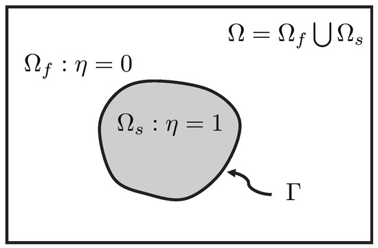 where u, , p, and are velocity, density, pressure, and kinematic viscosity of fluid; g is the gravitational acceleration. Note that, in Equation (2), the virtual force f is exerted only on the solid domain by volume-of-solid function .