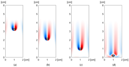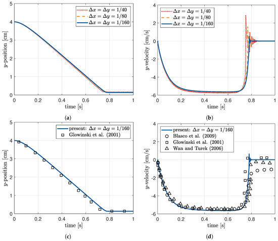 Simulated flow field featured by vorticity contours at various times is shown in Figure 2. Time traces of disk’s vertical position and velocity were particularly calculated and shown in Figure 3. Figure 3a,b shows the grid-independence of current computations. Basically, results under different mesh sizes coincide with each other except the velocity near the hitting of floor in Figure 3b. Here, we further adopt the result with the finest mesh size in Figure 3a,b to compare with [15,20,21] and show it in Figure 3c,d. Our result generally bears a good agreement with references mentioned above, especially with Glowinski et al. [15]. This can be told from the immediate velocity near the hitting of floor in Figure 3d, where actually none of [15,20,21] is close to one another. From Figure 3d, the disk is first accelerated by gravity, and then the fluid drag increases as disk’s velocity increases. When gravity is finally balanced by drag, the velocity of disk reaches its maximum terminal velocity, which is steady and not altered until hitting the floor. Note that the peak followed by oscillations in Figure 3d, happening near the hitting of floor in our computation, is because of the usage of collision model, described in Section 2.3. The peak and following oscillations imply the damping rebounds from the floor. The collision model is a necessary evil. Without it, falling solid object would generally penetrate the floor numerically.