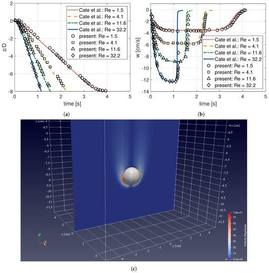 Here, the numerical simulation of sedimentation of a 3D sphere inside a fluid tank was conducted with physical parameters and geometry settings same as the experiment reported by Cate et al. [16]. The computational domain is set to based on the rectangular fluid tank of size mentioned in experiment. A sphere of diameter cm is initially centered at and released from rest with its density being kg/m, slightly larger than the density of ambient fluid. Following the experiment, various fluid density, , and dynamic viscosity, , were employed for simulations and are listed in Table 1 with Reynolds number defined as , in which is the terminal velocity. We conducted the numerical simulations in a uniform Cartesian grid with cm, time step s, and the results are depicted in Figure 4, where the time traces of sphere’s vertical position and velocity for each case are shown in Figure 4a,b, and a snap shot of vorticity magnitude contours for the falling sphere is shown in Figure 4c. We find that our numerical results are in excellent agreements with the experimental data in Reference [16].
