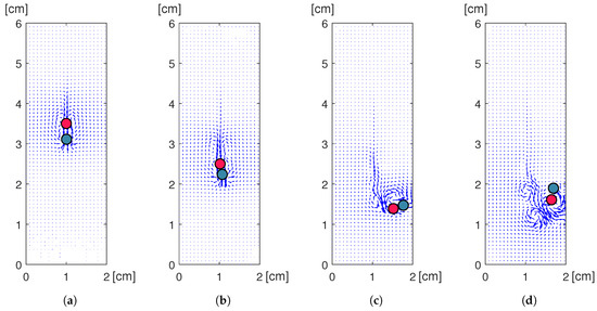 The positions of two tandem circular disks and the associated flow velocity field at time (a) t = 0.15 s, (b) t = 0.20 s, (c) t = 0.25 s, and (d) t = 0.3 s.