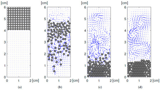 The positions of 10 × 10 circular disks during sedimentation and the associated flow velocity fields at time (a) t = 0 s, (b) t = 0.6 s, (c) t = 1.5 s, and (d) t = 2 s.