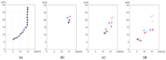 The numerical results are displayed in Figure 7. Figure 7a shows triangle’s trajectory and orientation, and Figure 7b–d shows the snap shots of flow field at certain times during the falling. From that, we can tell the falling pattern is fluttering at the beginning, followed by tumbling at some tipping point. A MATLAB code for current sedimentation simulation of a regular triangle is attached at Appendix A for readers further interested in this problem.
