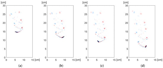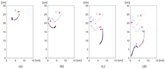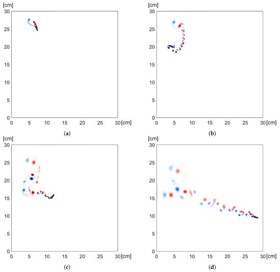 Flow field featured by vorticity contours at time (a) t = 0.2 s, (b) t = 0.4 s, (c) t = 0.6 s, and (d) t = 0.8 s.